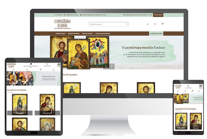 Η Christian Icons είναι βιοτεχνία παραγωγής αντίγραφων βυζαντινών εικόνων. Ξεκίνησε την πορεία της στο χώρο από το 1960 με σεβασμό στον άνθρωπο που το επιλέγει ως αντικείμενο θρησκευτικής λατρείας ή/και διακοσμητικό, έργο τέχνης. Δια μέσου της ιστοσελίδας το ενδιαφερόμενο κοινό μπορεί να παραλάβει τα προϊόντατα απευθείας στο σπίτι ή σε οποιοδήποτε σημείο που ορίζεται η παραλαβή.